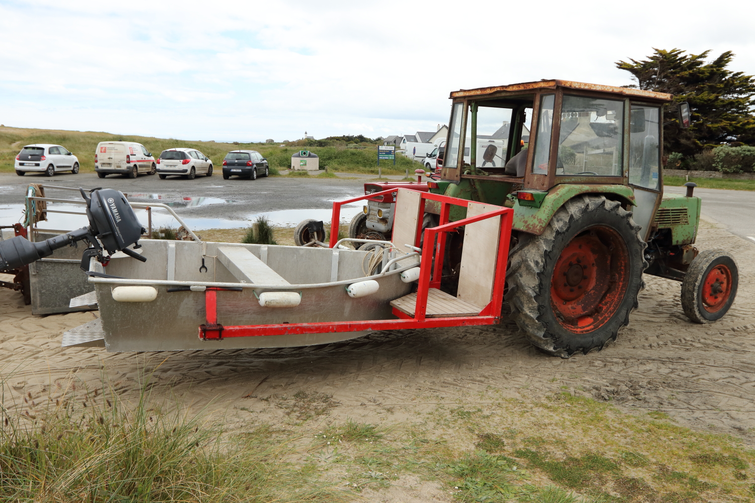 Le tracteur et sa remorque spécifique sont couramment utilisés pour sortir les embarcations. Avec la pluie, sur le sentier du GR34, les escargots pullulent.