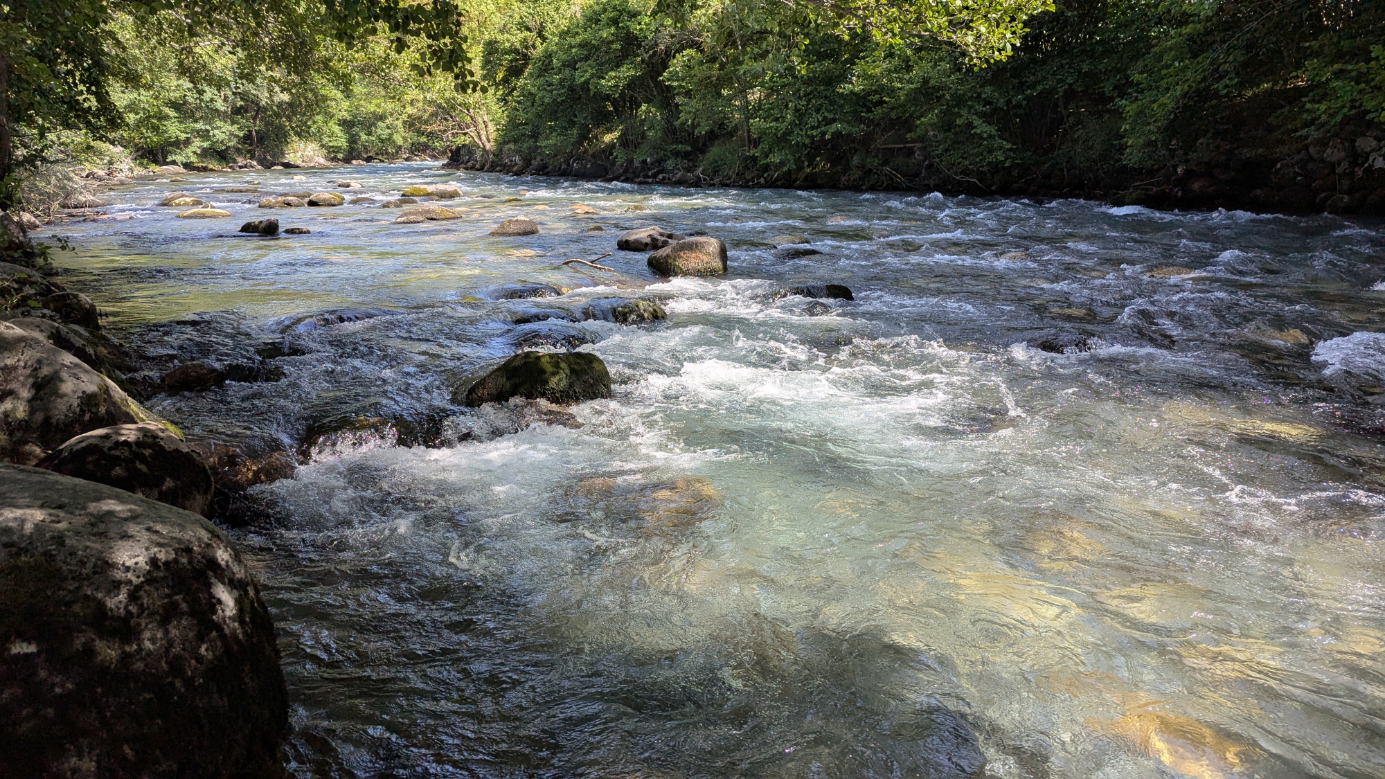 Avec 34°C en extérieur, notre premier réflexe en arrivant sur la commune d’Arreau a été de se jeter dans la Neste d’Aure. Avec ses variantes de couleur, cette rivière est irrésistible pour la baignade. En passant devant nous, le moniteur du raft a demandé à Annemarie si elle avait chaud. Avant même de lui répondre, il en a profité pour l’arroser copieusement avec sa pagaie… Rires assurés.