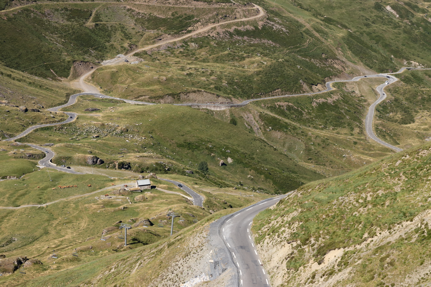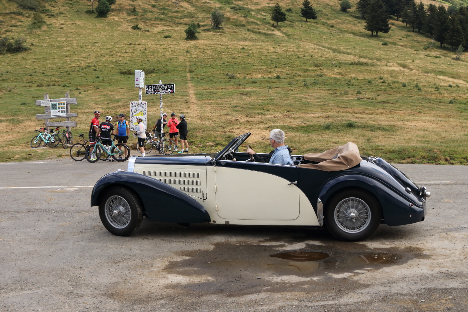 C’est reparti mon JJ pour une nouvelle montée. Depuis quelques jours, de petites dépressions nous arrivent d’Espagne et les températures ont dégringolé. Une Bugatti 57C Cabriolet était sur le col également, j’ai eu juste quelques secondes pour admirer cette légende, et une belle Blonde d’Aquitaine dans son pâturage.