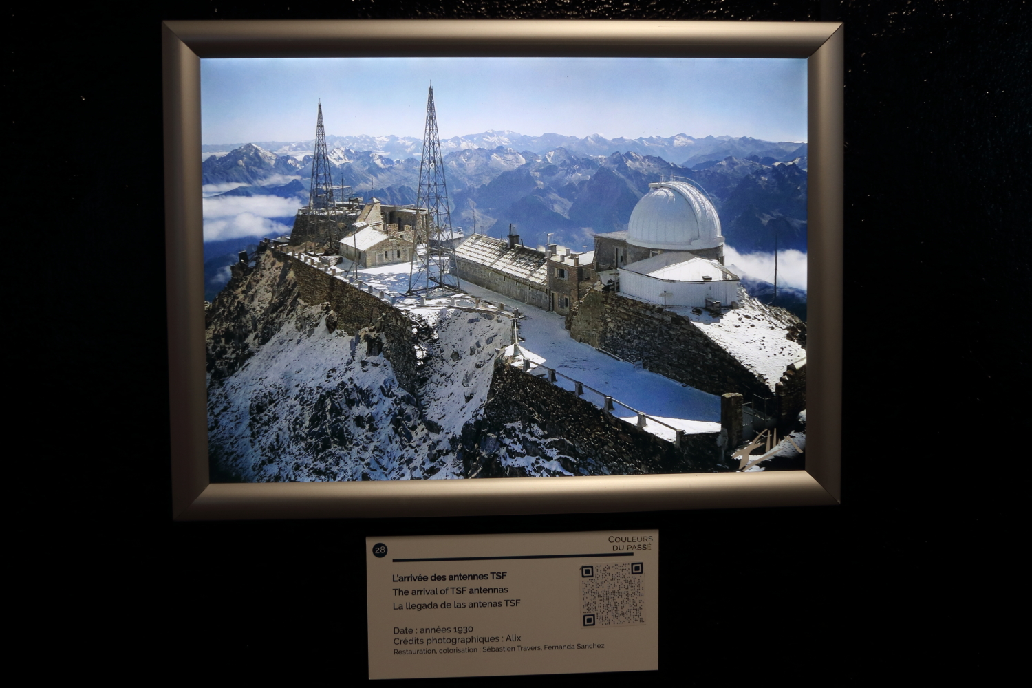 Sur la terrasse, on pointe facilement les montagnes avec le panneau indicateur. Bon nombre de visiteurs se pressent sur la passerelle suspendue dans le vide pour marquer l’évènement.