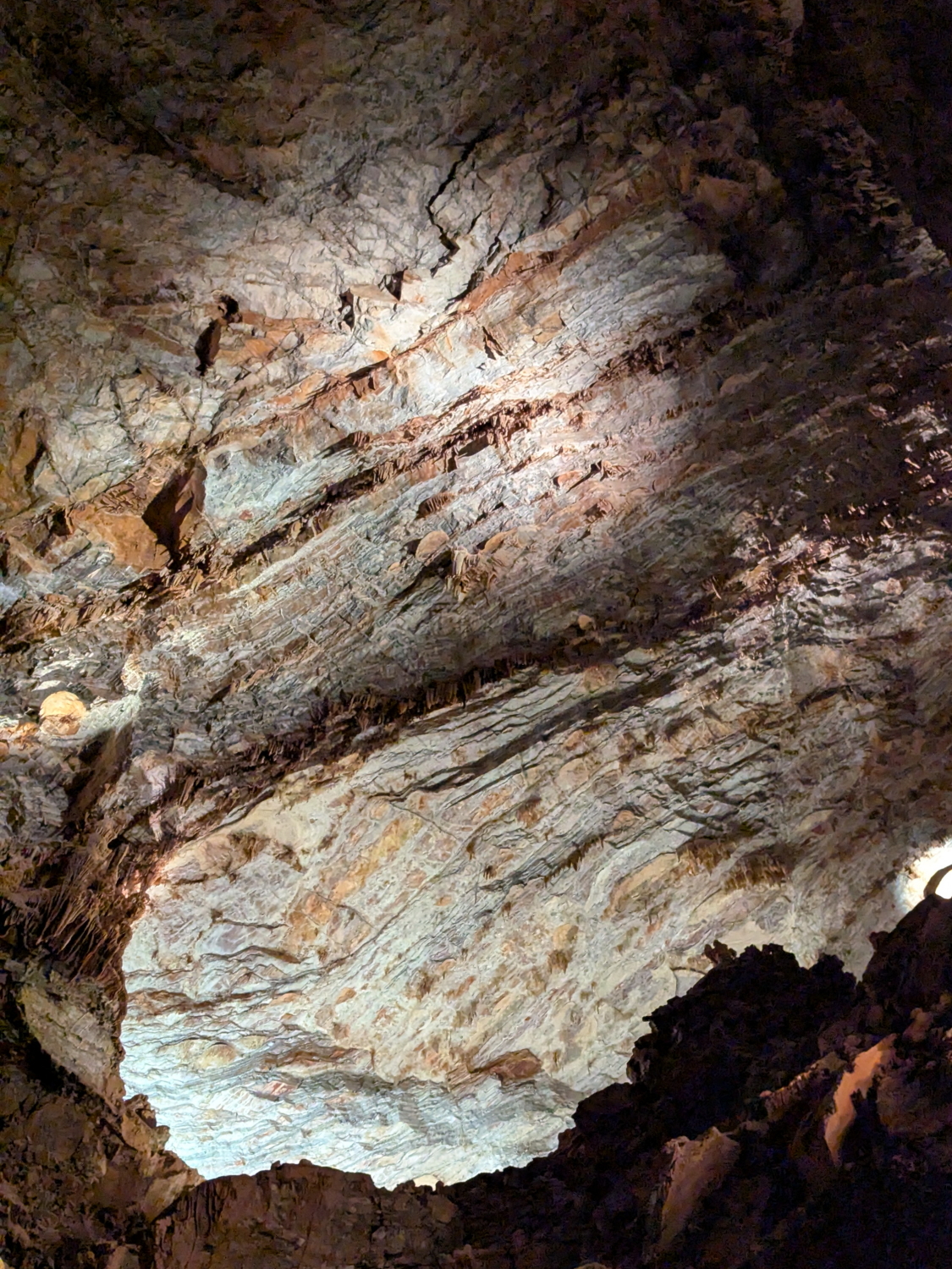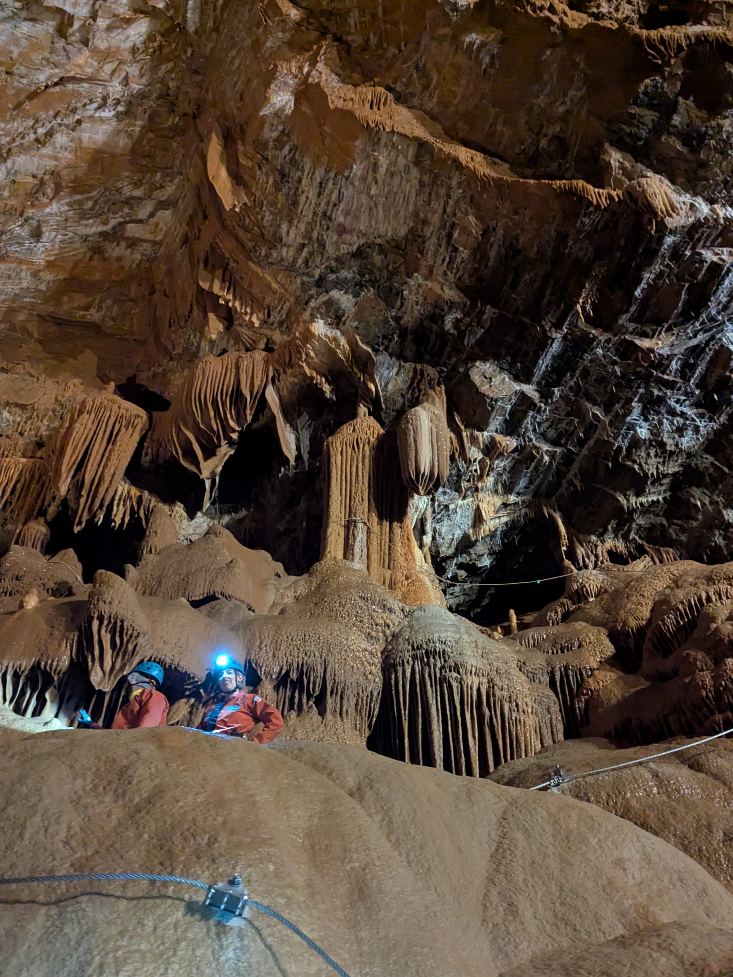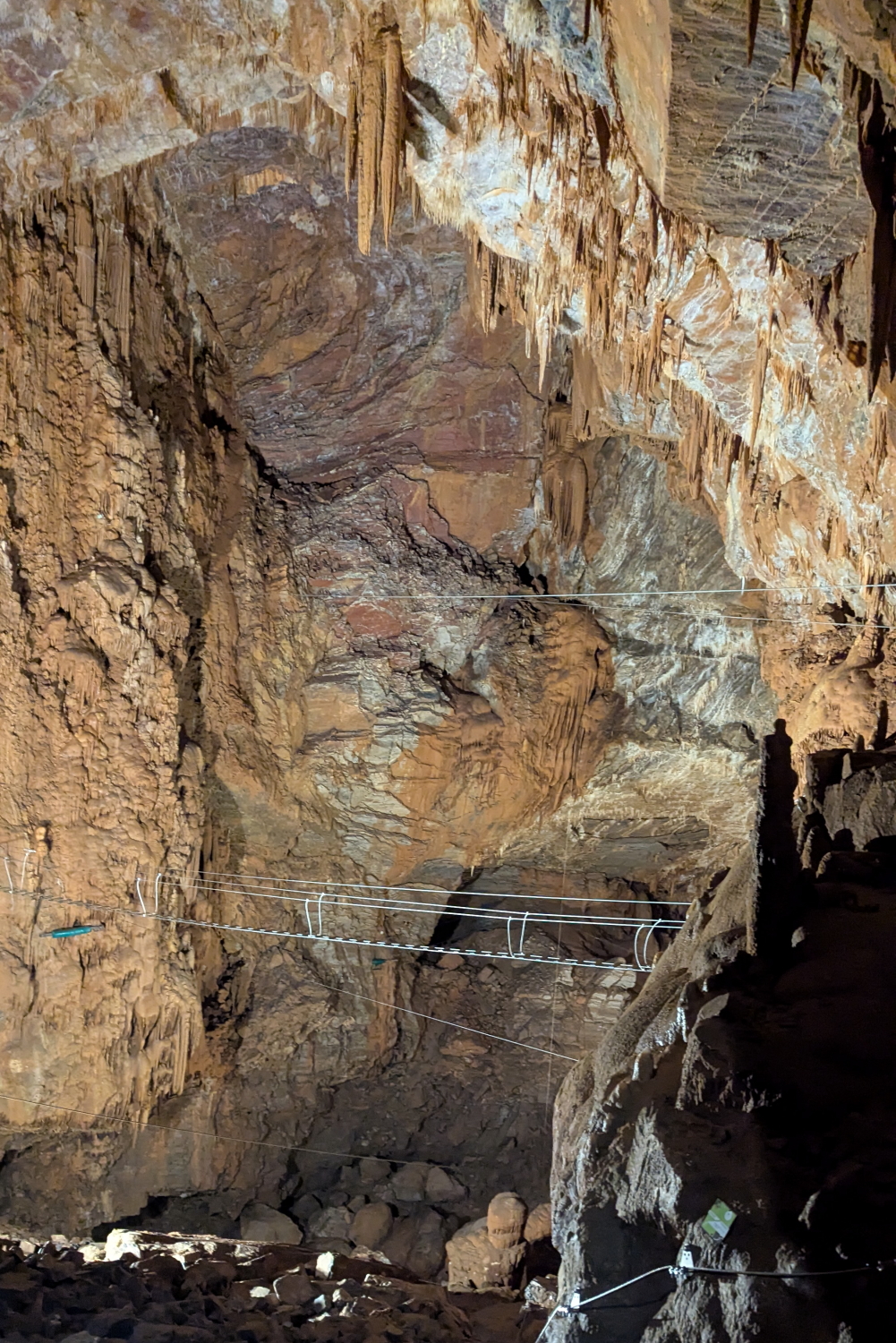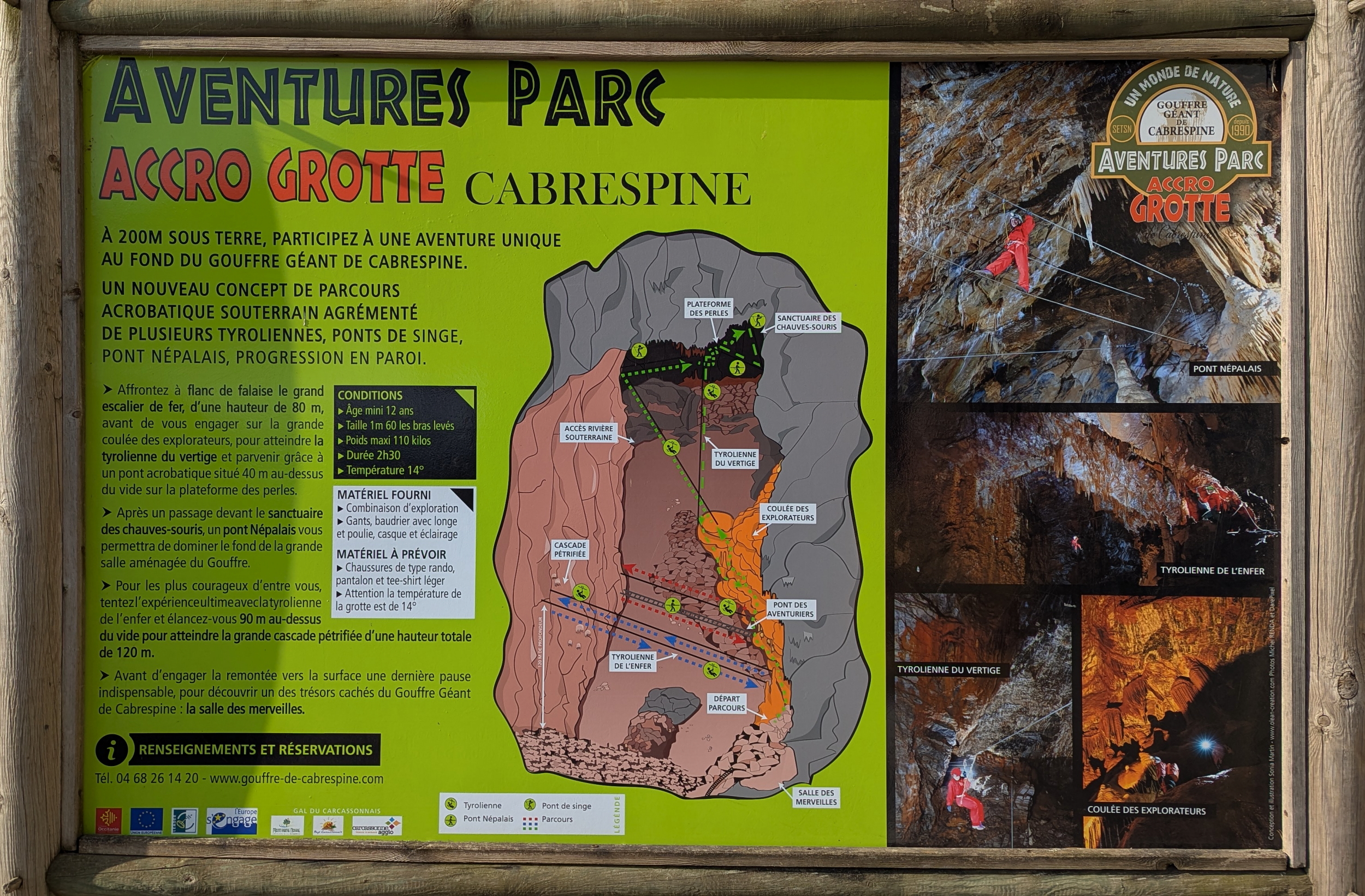 Nous nous sommes rabattus sur une autre découverte à 14 km plus au sud, le gouffre de Cabrespine. Plusieurs activités y sont proposées, j’ai choisi l’accro-grotte en précisant que cela requiert une bonne condition physique. Cette expérience m’a demandé un dépassement de mes limites, très content de l’avoir fait mais je ne m’y risquerais pas une deuxième fois. En effet, lorsqu’on est totalement débutant, on force plus que de raison. D’autre part et surtout, le port du casque associé à une combinaison quasiment hermétique m’ont conduit après 2 h 30 d’effort à une déshydratation (200 m de dénivelé + et -). Sur le parcours, le guide nous a offert un verre d’eau, conscient de l’effort consentit par ses nouveaux explorateurs. Malgré la lampe frontale, trouver ses repères dans la pénombre n’est pas chose aisée. Curieusement, ni le stress des exercices, ni le vertige ne m’ont gêné.