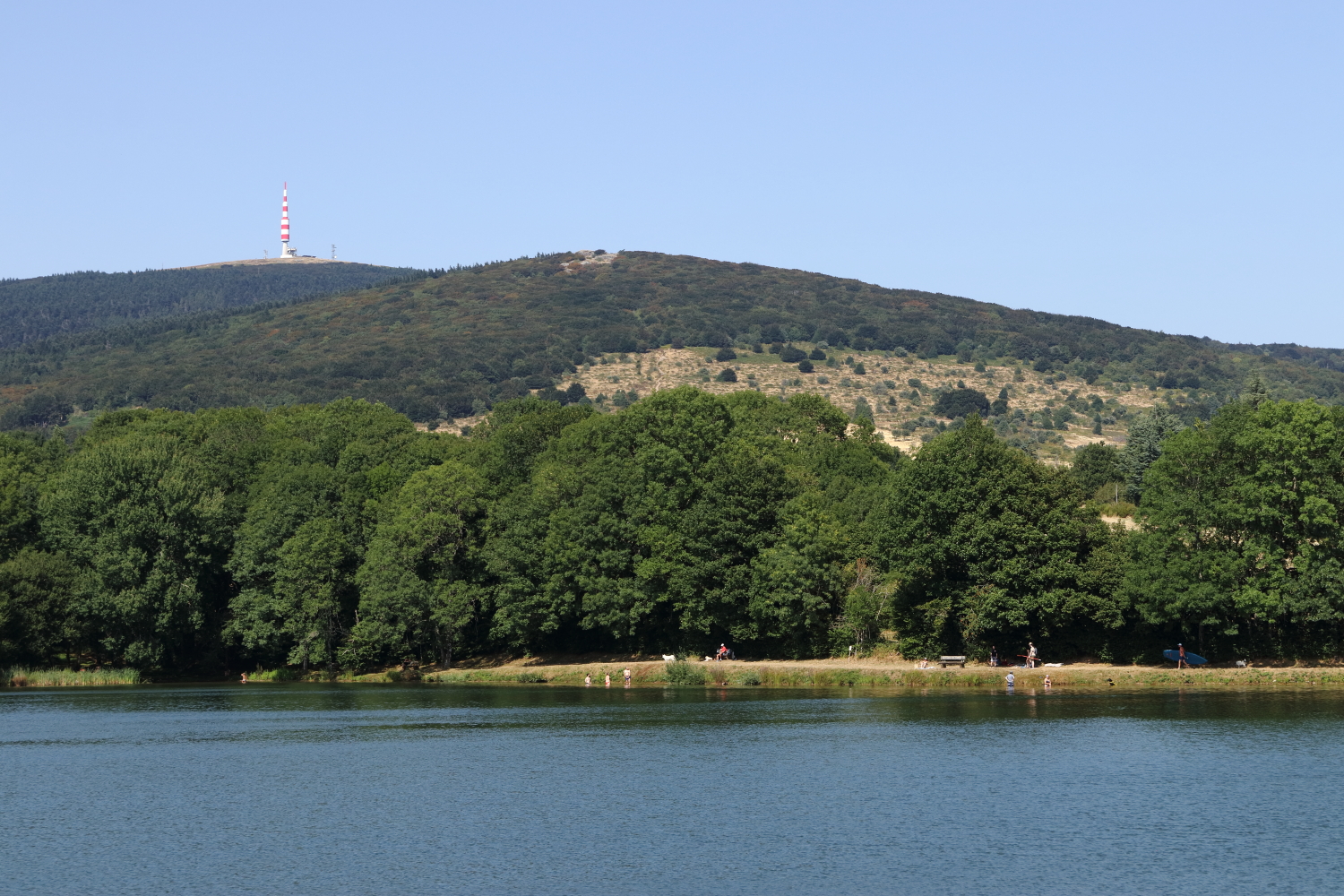 Nous repartons pour le lac de Birotos au pied du point culminant de la Montagne Noire, le pic de Nore (1211 m), reconnaissable à son antenne. Avec ces fortes températures, les conditions météo n’étaient pas favorables pour profiter de son panorama, une ligne de crête entre le Tarn et l’Aude. Au XVIIIᵉ siècle, l’astronome Pierre Mechain y effectua des relevés du méridien terrestre en vue d’établir une nouvelle unité de mesure : le mètre. Autrefois, en réalisant de nombreuses glacières, le village de Pradelles-Cabardès s’était spécialisé dans la production de glace neige. La glace artificielle mit fin à cette activité en 1932.