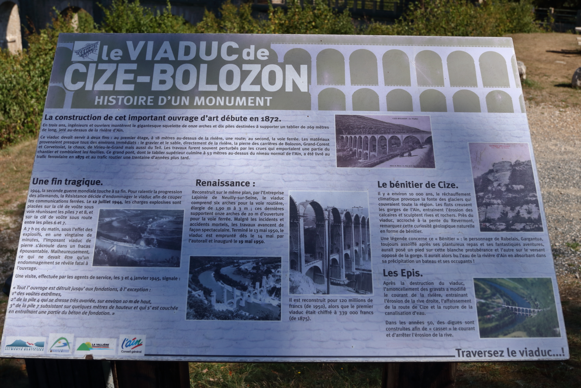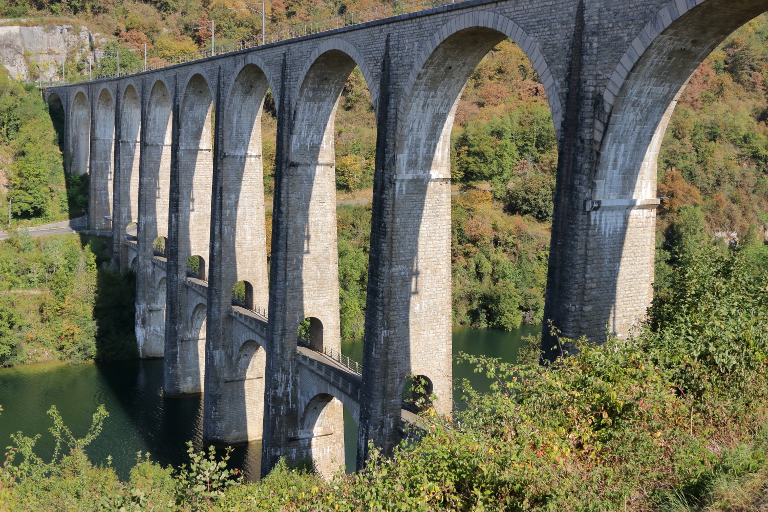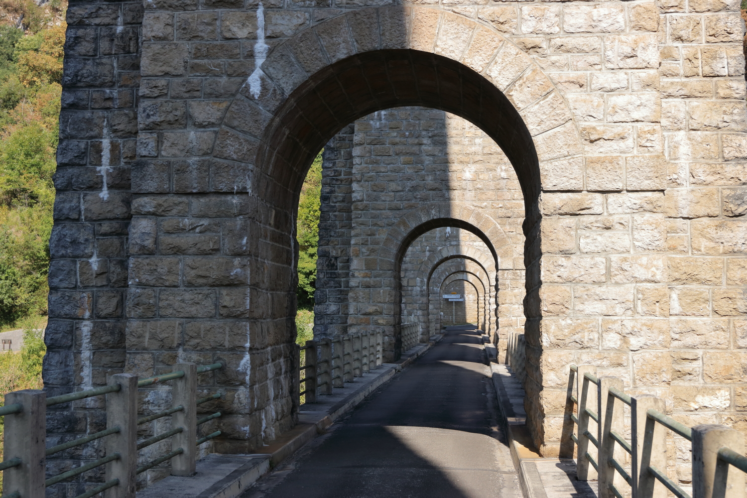 En remontant les gorges de l’Ain, le viaduc de Cize-Bolozon. Un édifice spectaculaire au passé tourmenté, son tablier supérieur s’étire sur 269 m.