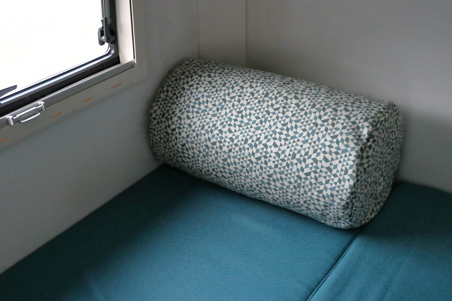 Le boudin fait office de coussin en journée et renferme le drap et la couette du lit.
