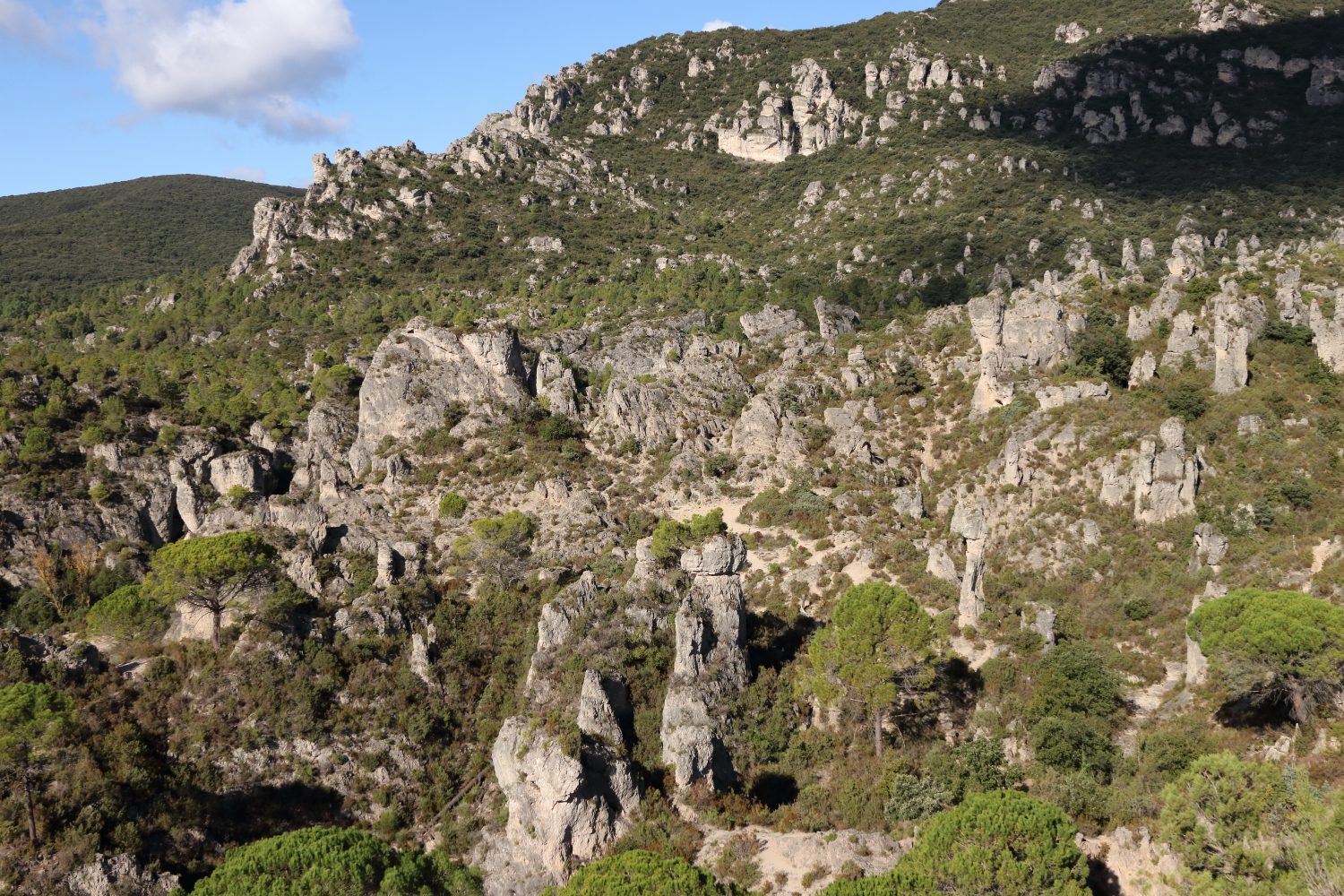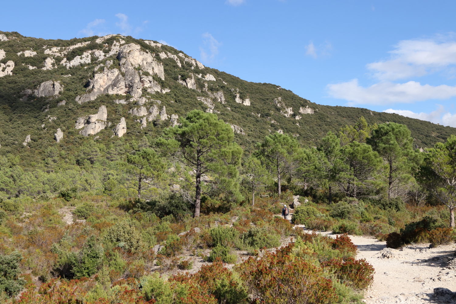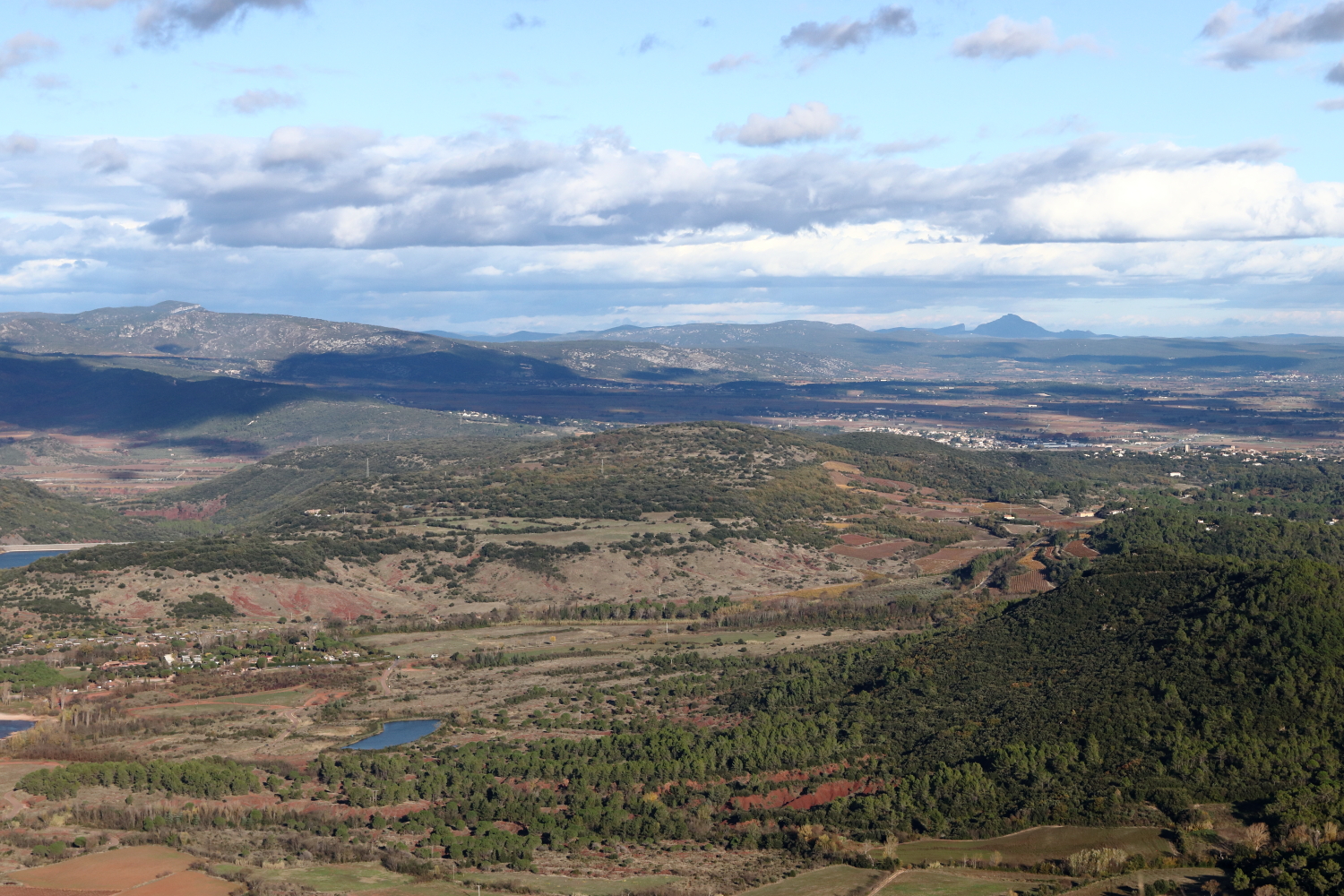 Nous sommes face au cirque au tiers du parcours, il nous faut encore franchir la crête de cette montagne pour apercevoir le lac du Salagou.