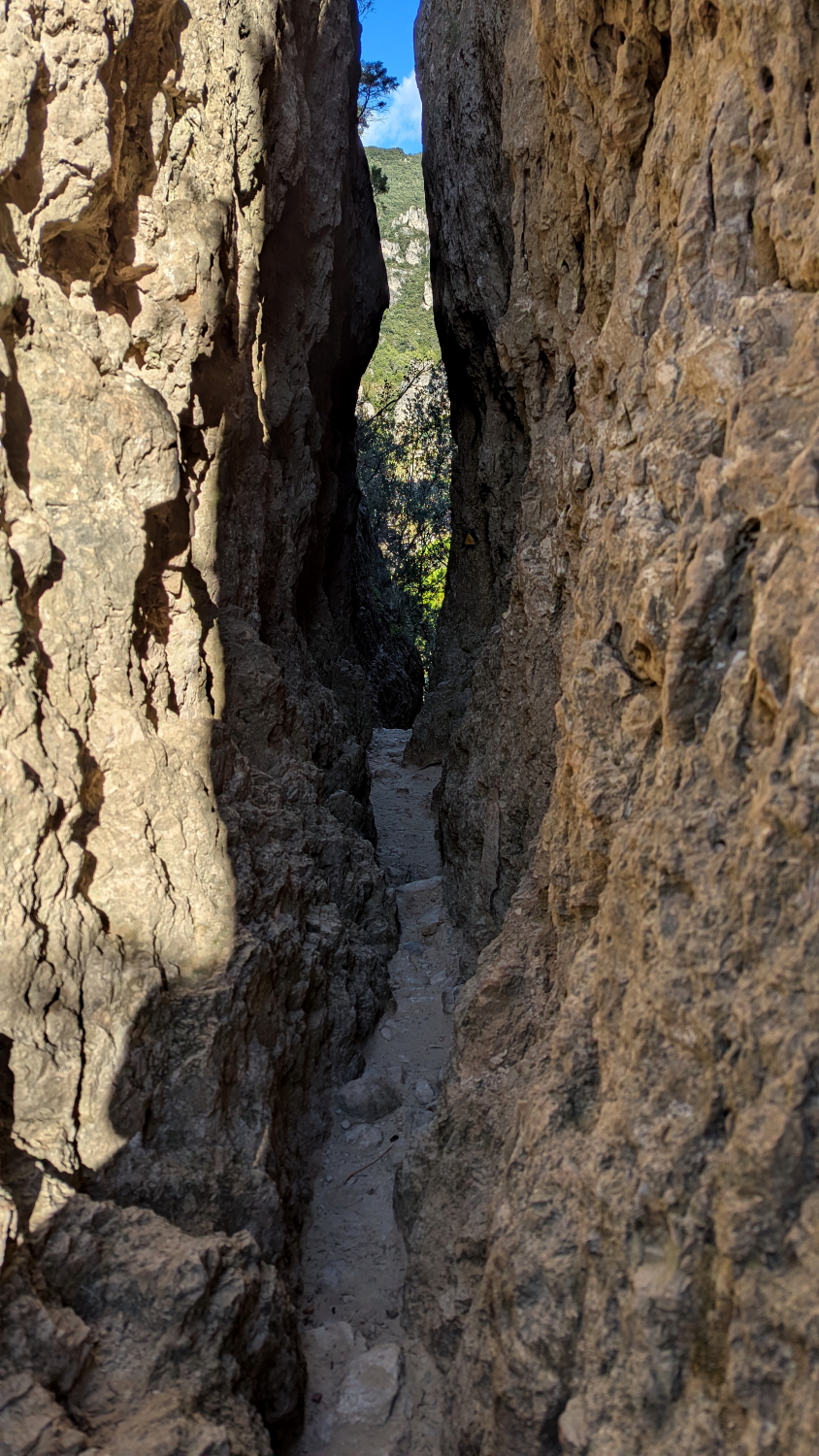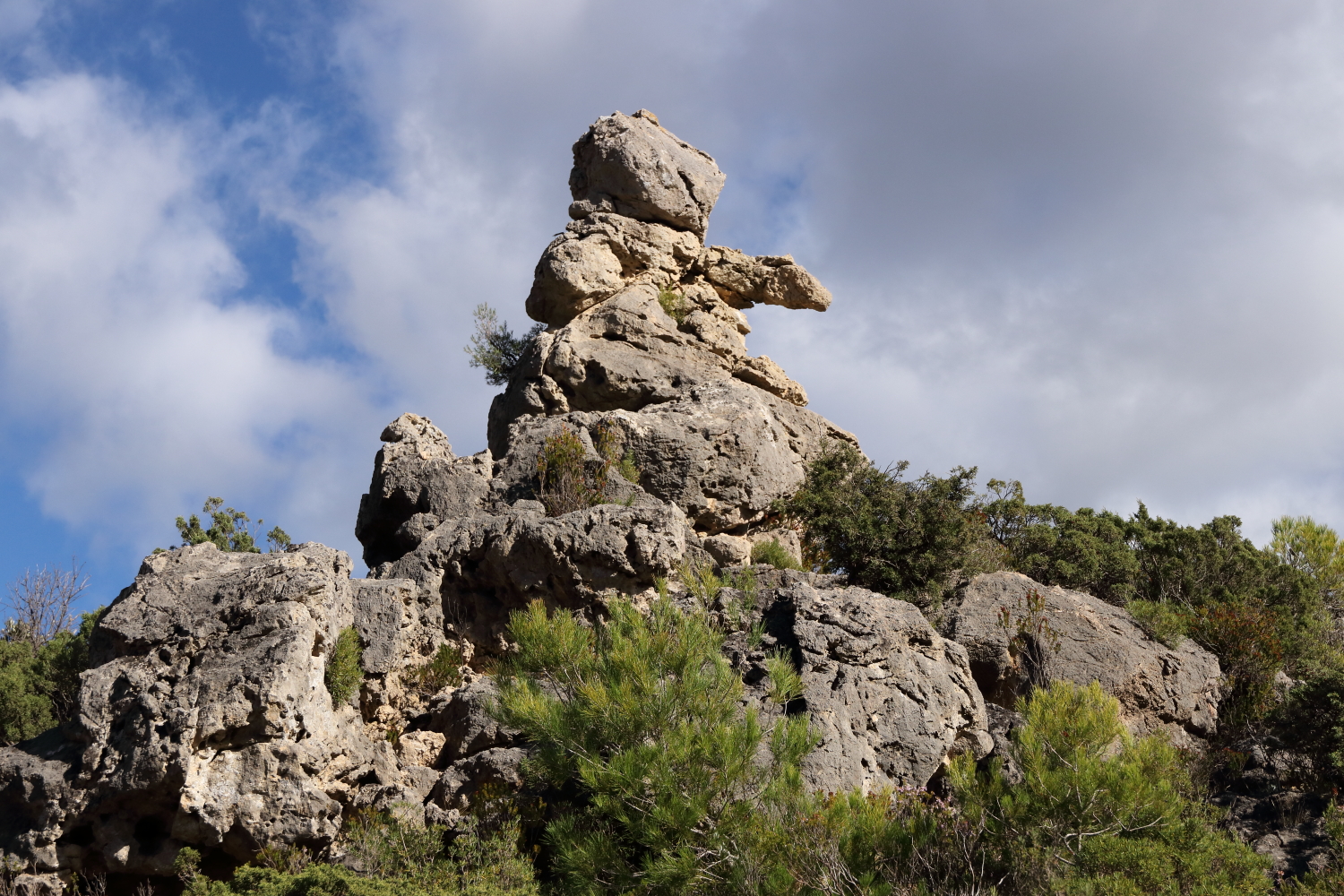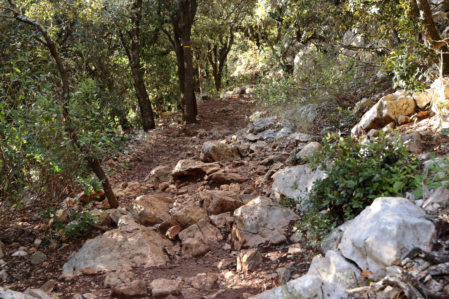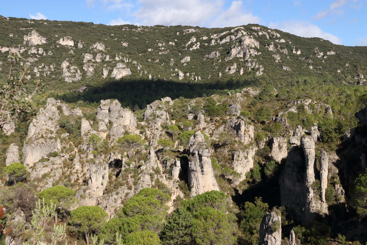 Nous sommes face au cirque au tiers du parcours, il nous faut encore franchir la crête de cette montagne pour apercevoir le lac du Salagou.