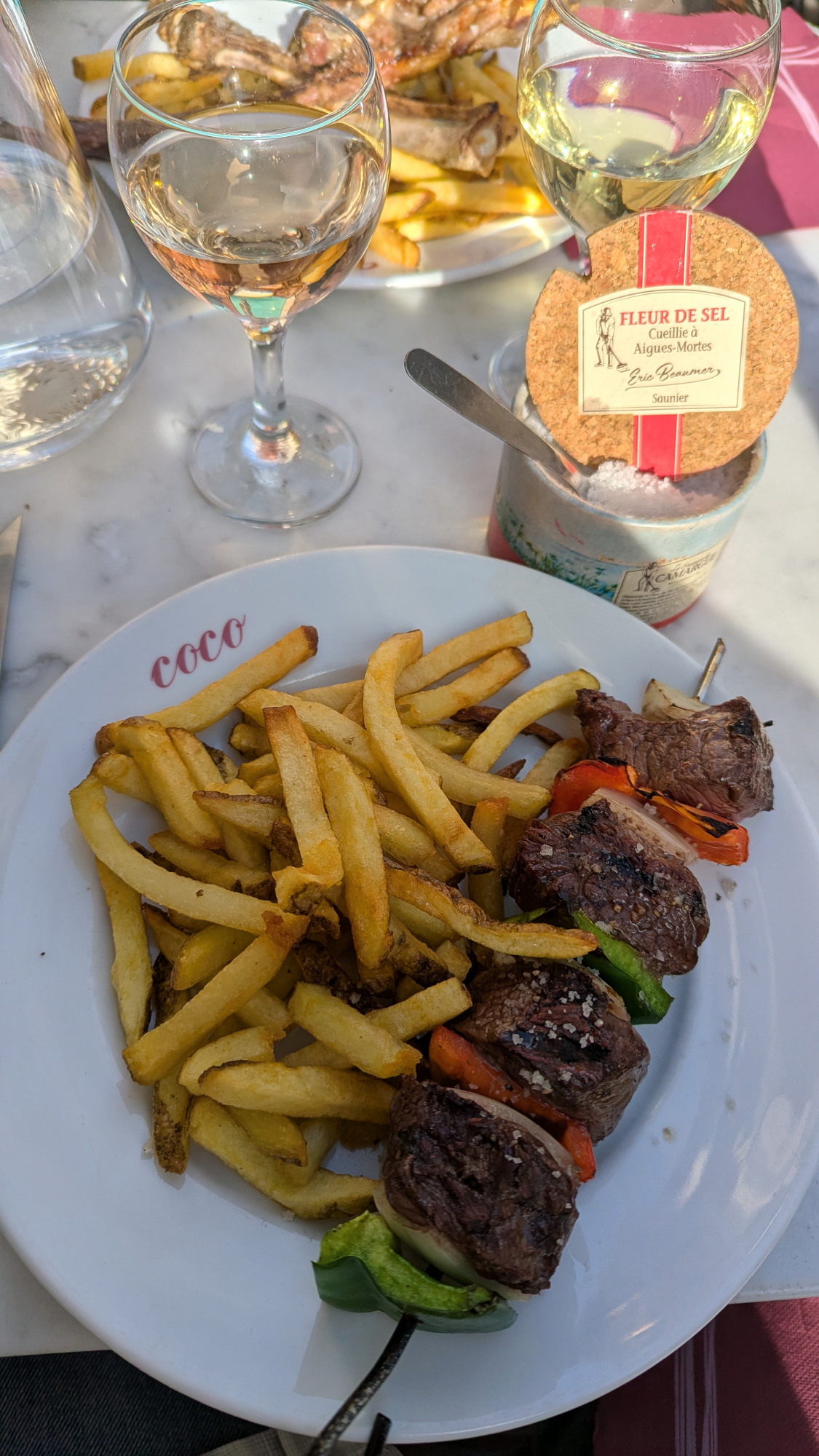 Selon les propos d’une habitante, il y a encore une dizaine d’années, le taureau était élevé dans un cadre folklorique et sa consommation n’était pas courante. Aujourd’hui, c’est l’inverse, la demande en viande dépasse l’offre. Accompagné d’un vin des sables local, nous avons choisi pour déjeuner une brochette de taureau à la fleur de sel régionale.