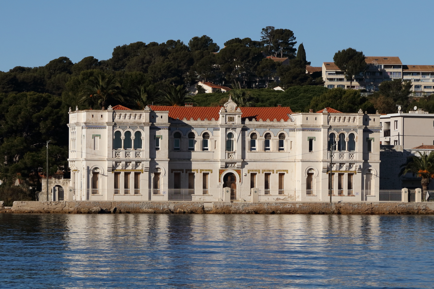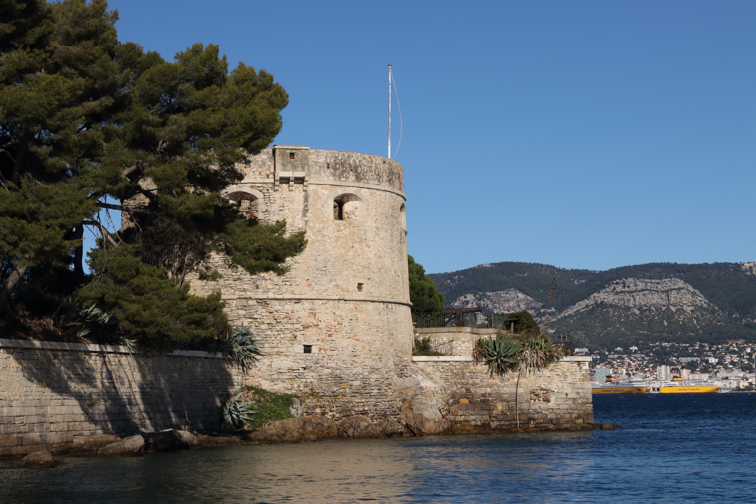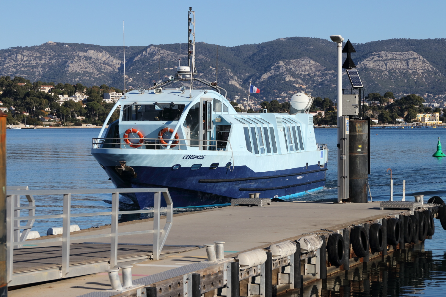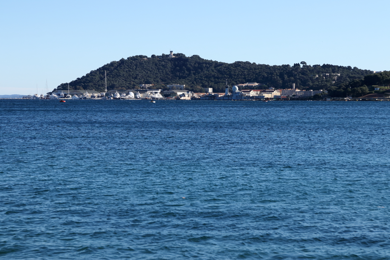 Notre navette maritime arrive, nous quittons Saint-Mandrier-sur-Mer pour Toulon. Ce mode de transport est à la fois économique, très rapide et touristique. La grande rade nous donne un aperçu de belles villas mauresques, d’élevage de poissons et du trafic maritime.