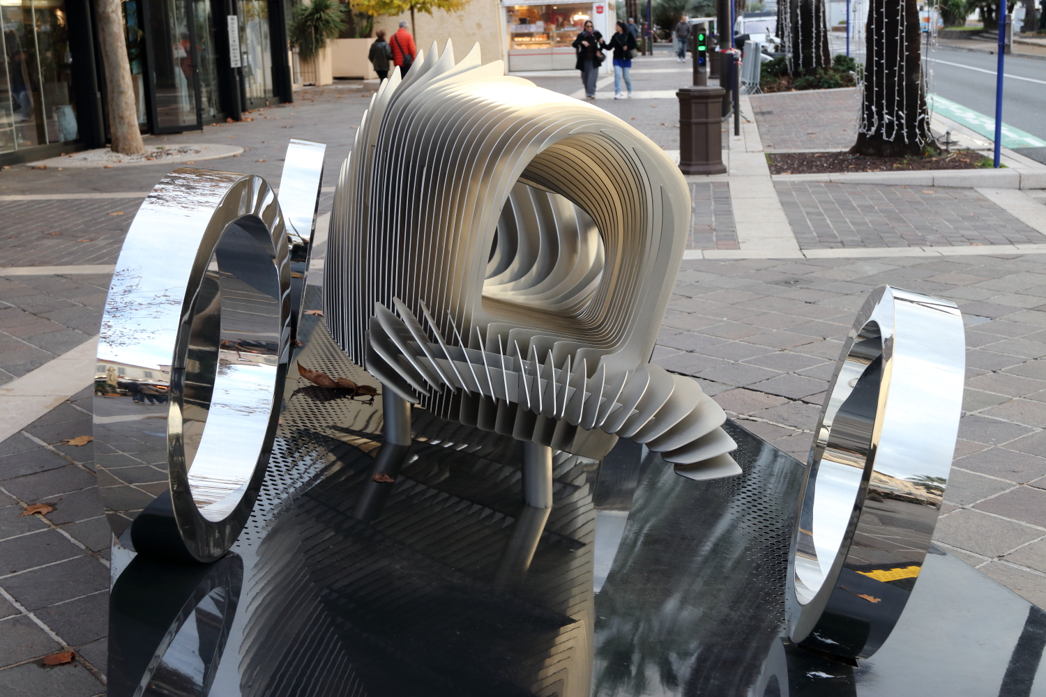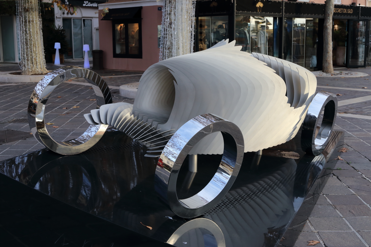 Une Bugatti revisitée, un concept que j’ai bien apprécié suivant son angle de vue. Un squelette qui donne une vision cinétique selon Antoine Dufilho, un mouvement dynamique provoquant un effet d’accélération ou de décélération. La lumière du moment en accentuait l’amplitude.