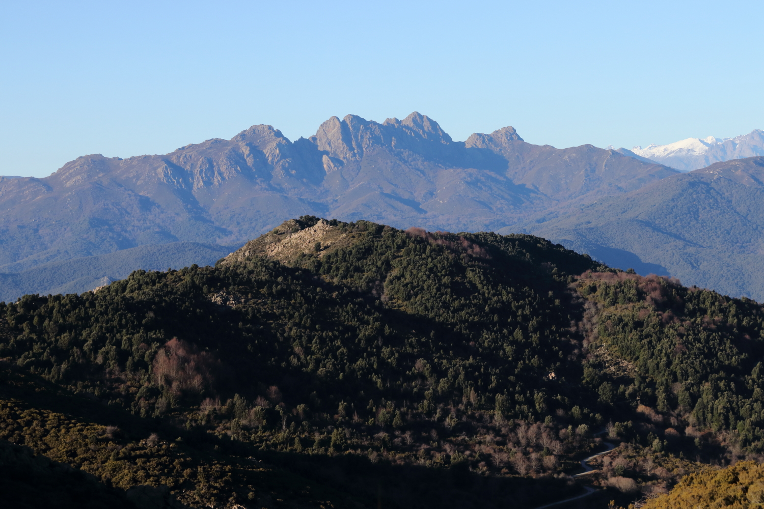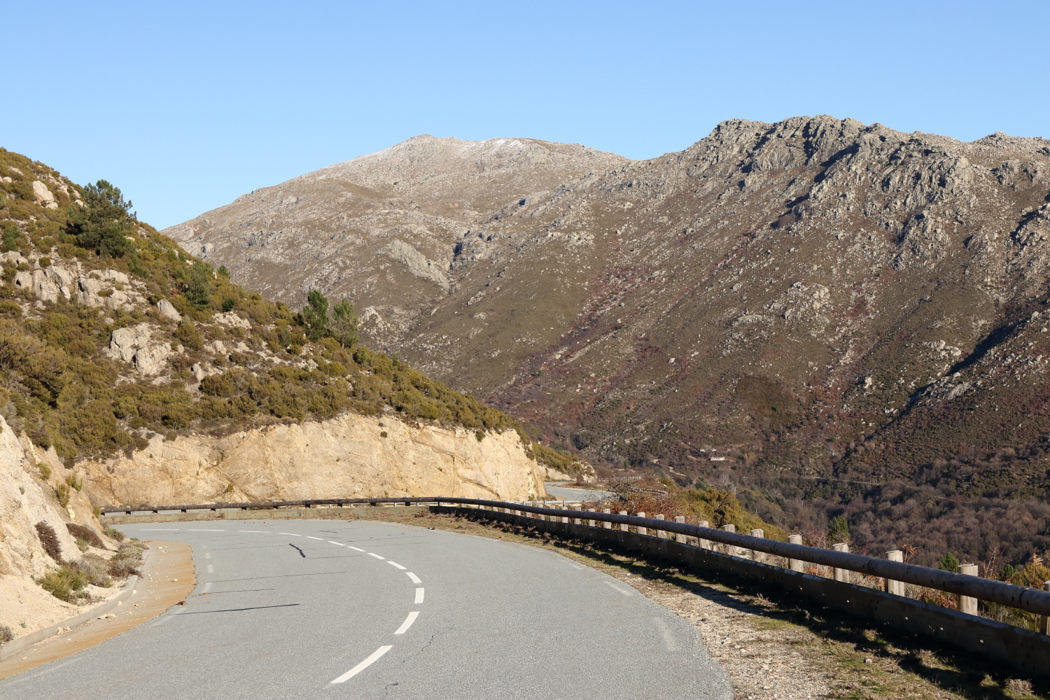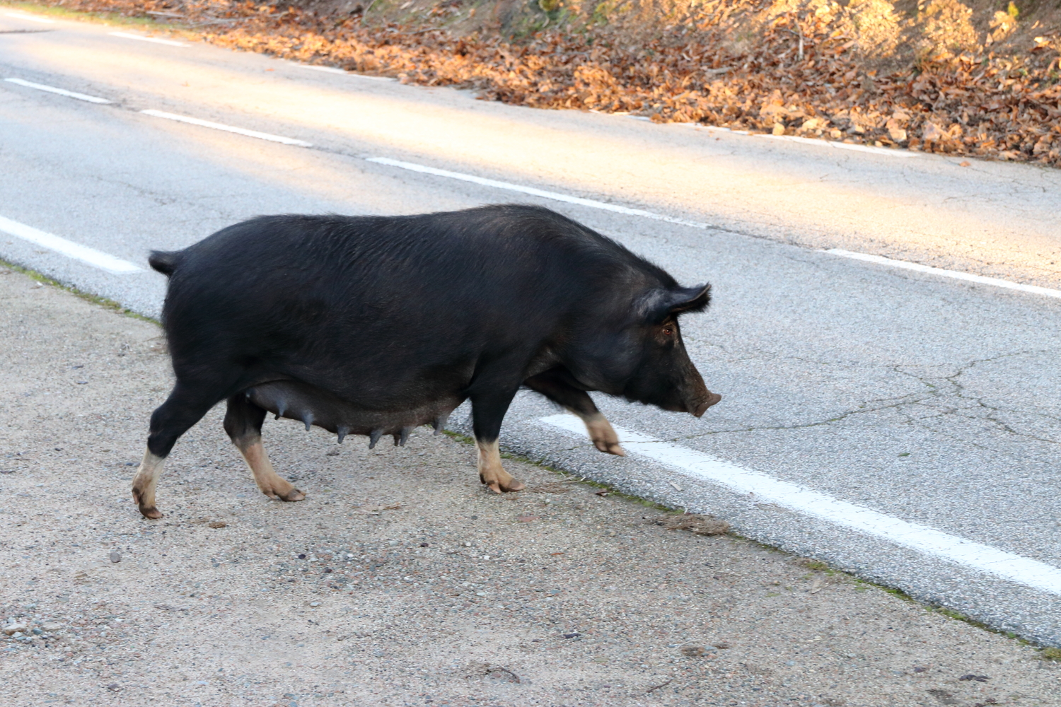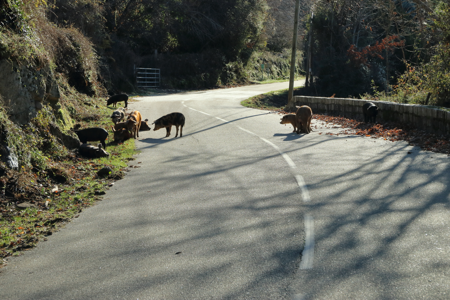La départementale D69 entre Vivario et Sartène est l’un des itinéraires les moins faciles mais des plus spectaculaires. Elle traverse le centre de l’île de la Corse-du-Sud par le col de Verde (1289 m). À cette saison, avec la chute des feuilles, les panoramas sont grands ouverts. Le porcu nustrale est la race de cochon traditionnel corse vivant en semi-liberté dans les forêts de chênes et de châtaigniers.