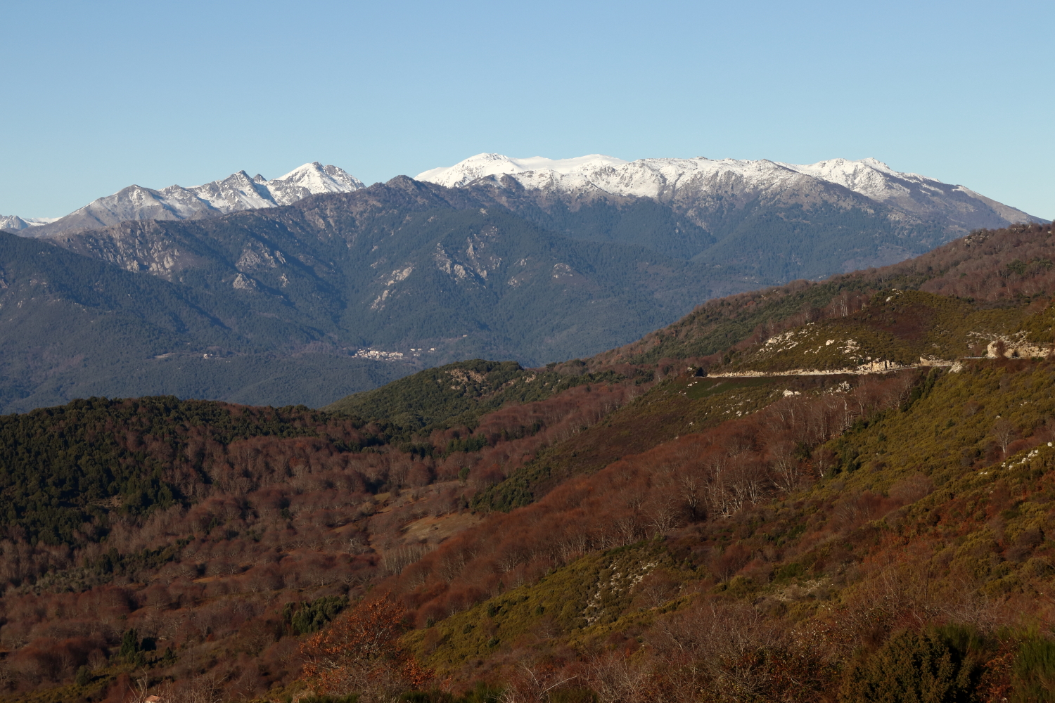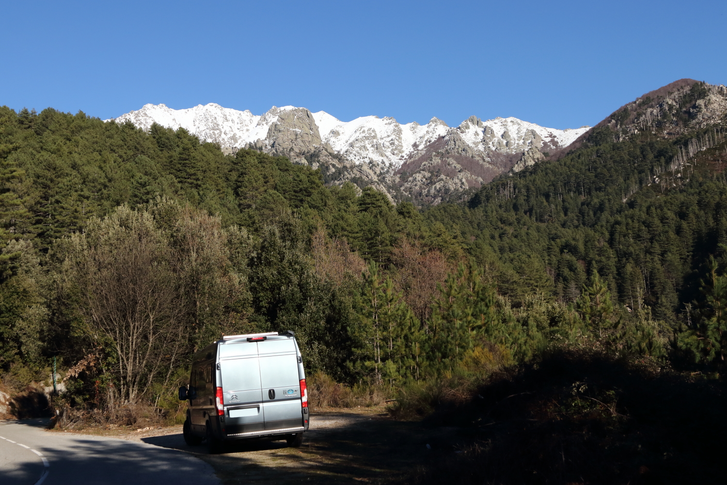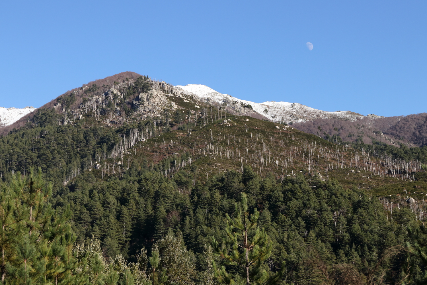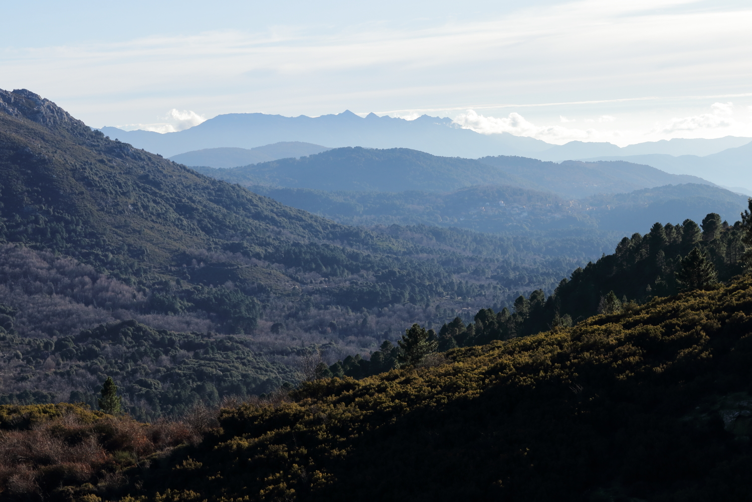 La départementale D69 entre Vivario et Sartène est l’un des itinéraires les moins faciles mais des plus spectaculaires. Elle traverse le centre de l’île de la Corse-du-Sud par le col de Verde (1289 m). À cette saison, avec la chute des feuilles, les panoramas sont grands ouverts. Le porcu nustrale est la race de cochon traditionnel corse vivant en semi-liberté dans les forêts de chênes et de châtaigniers.