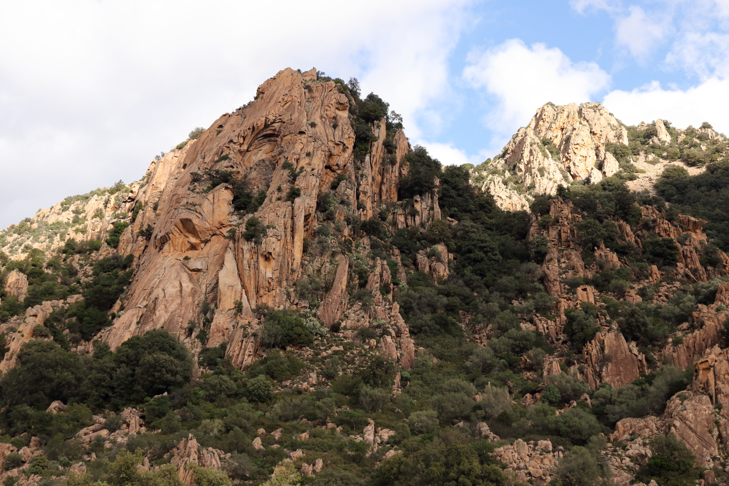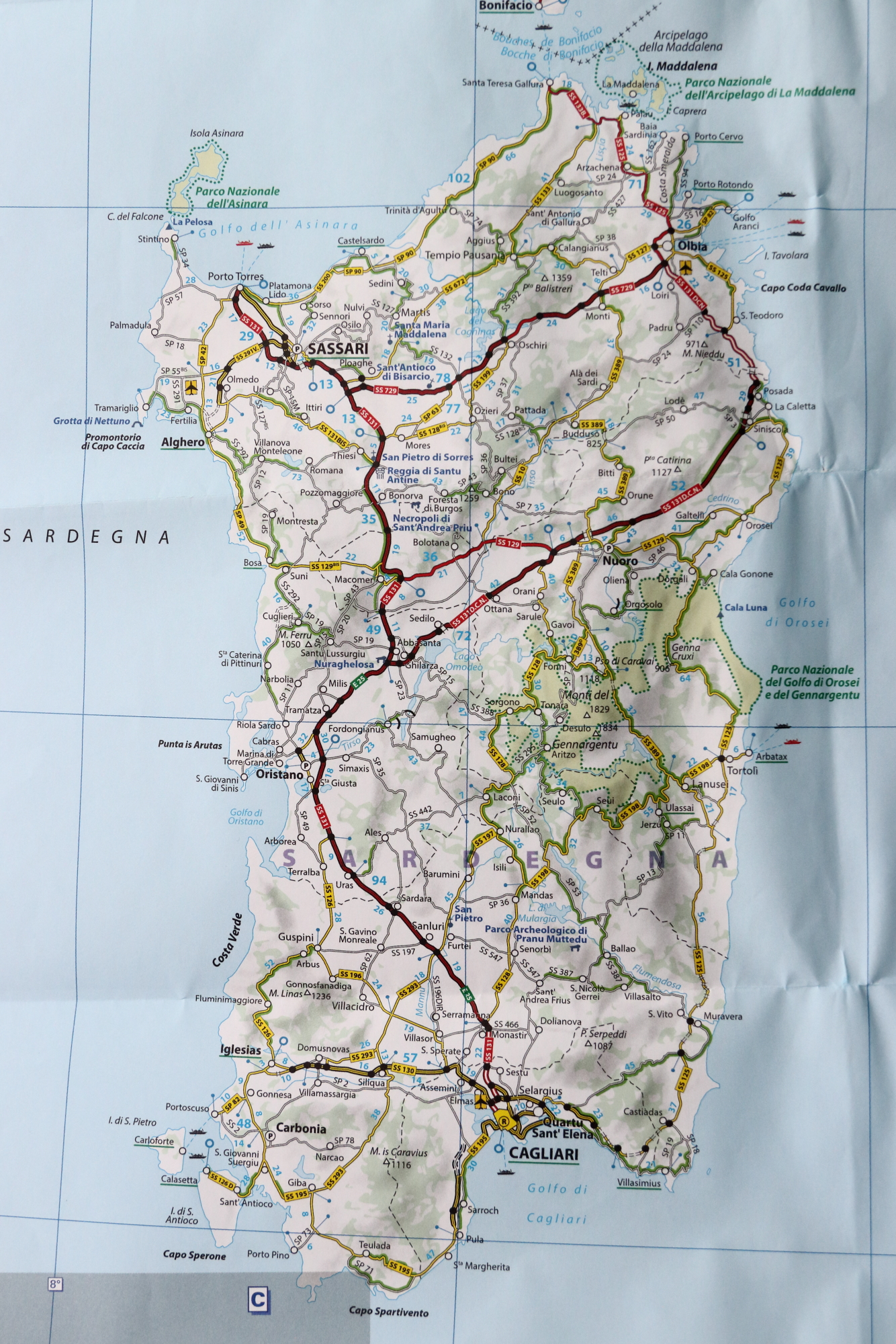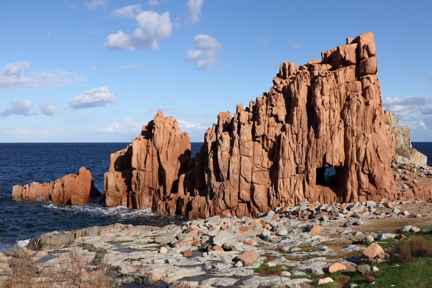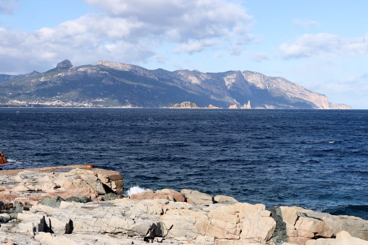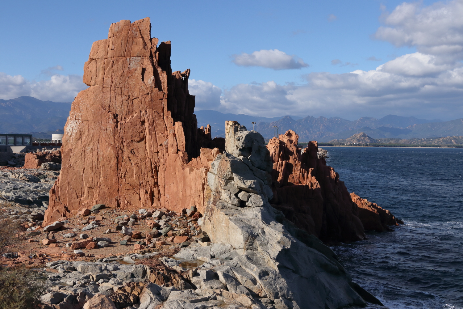 C’est une île de moyenne montagne où le réseau routier est en général de bonne qualité. Entre Orosei et Tortoli, au passage d’un col légèrement enneigé, la température était de 0°. Un contraste en arrivant à Arbatax avec un grand soleil pour admirer sa veine rocheuse sortant de l’eau, une curiosité géologique locale.