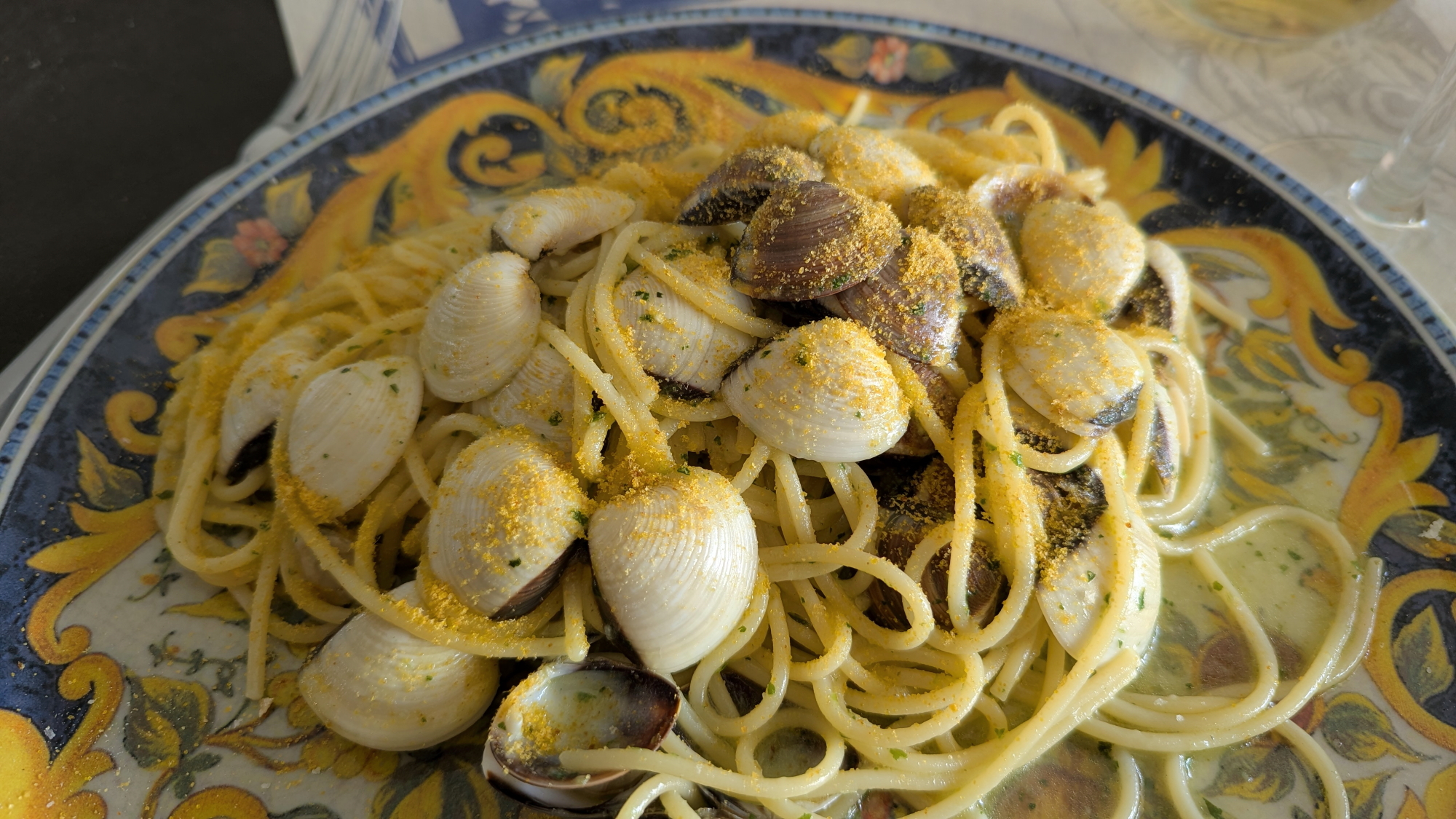 C’est une boisson très populaire, la liqueur de myrte est obtenue après macération d’une baie sauvage, un toast partagé avec le patron du restaurant. Les spaghettis alle vongole sont originaires de Naples, on en mange partout en Italie. Par respect envers le cuisinier, on ne doit pas couper les pâtes, mais les rouler avec sa fourchette dans l’assiette.