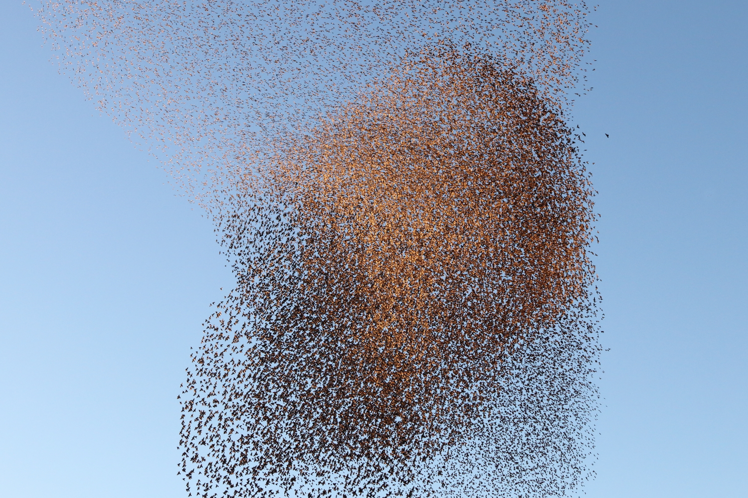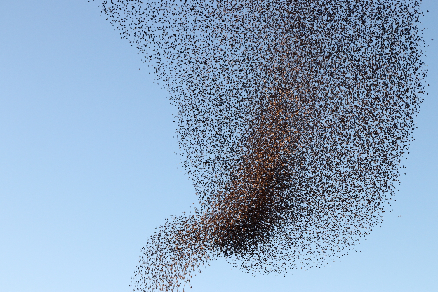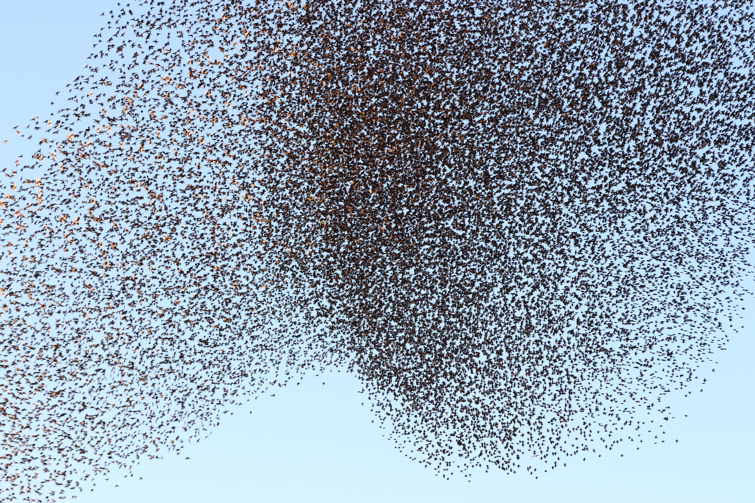 C’est un ballet aérien de milliers d’étourneaux qu’on a eu la chance d’observer. Oscillant au-dessus de nos têtes, cela paraissait effrayant et fascinant au vu de la quantité astronomique que cela représente. Face au soleil, leur couleur variait suivant l’orientation de leur déplacement, allant du sombre au marron clair.