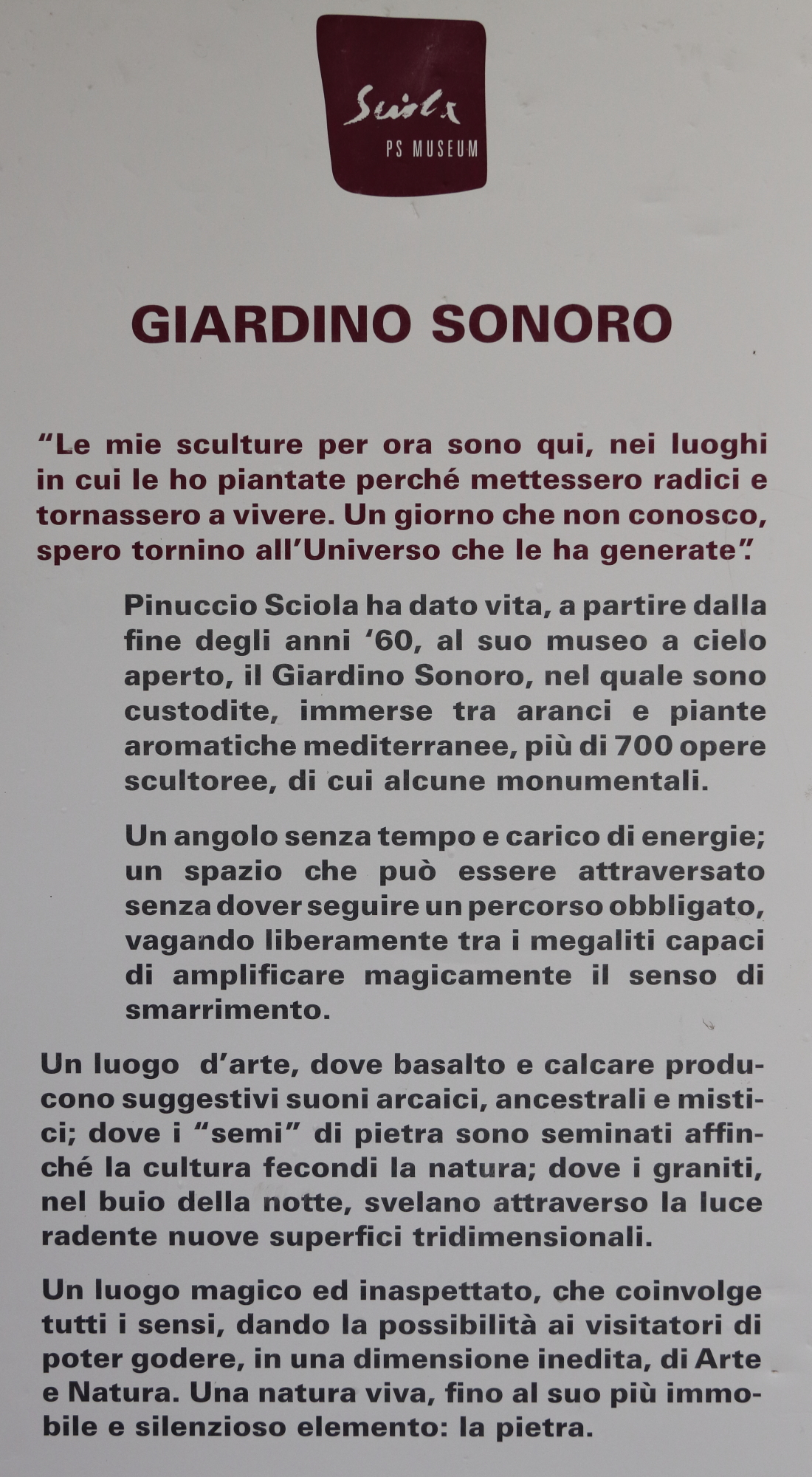 Pinuccio Sciola est un autodidacte qui a fréquenté l’Université de la Nature comme il se plaisait à le dire. Il a commencé très jeune à sculpter les pierres avant d’intégrer l’École des Beaux-Arts de Cagliari. En 1973, il rencontre et collabore avec David Alfaro Siqueiros, l’un des pères fondateurs du muralisme mexicain. Il fonde en 1984 à San Sperate le Centre international de travail de la pierre.