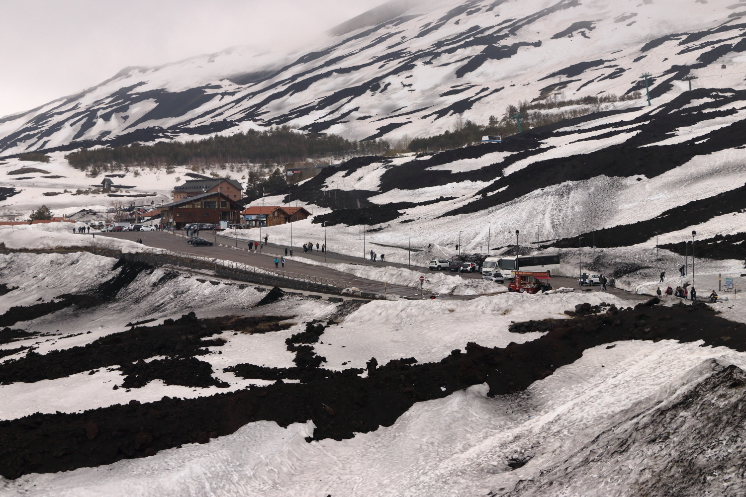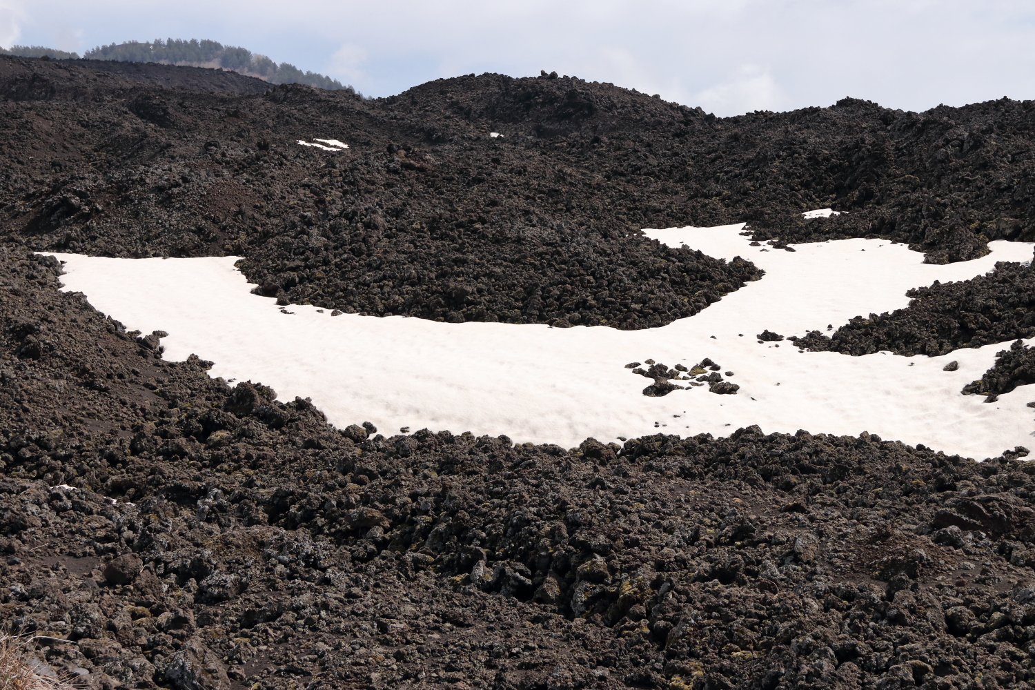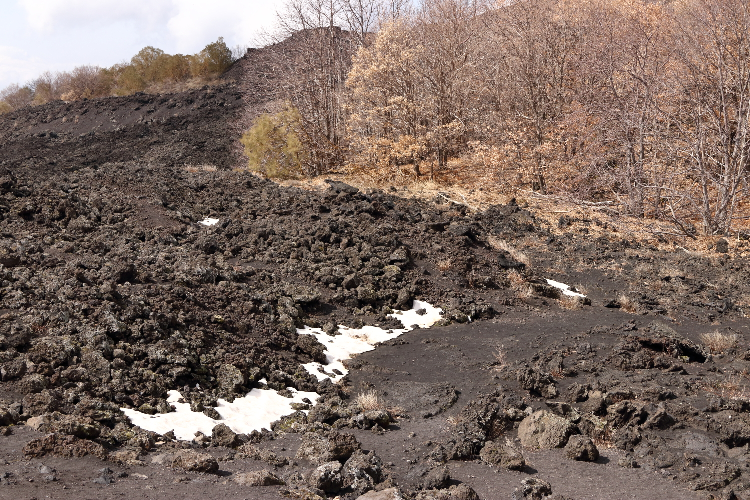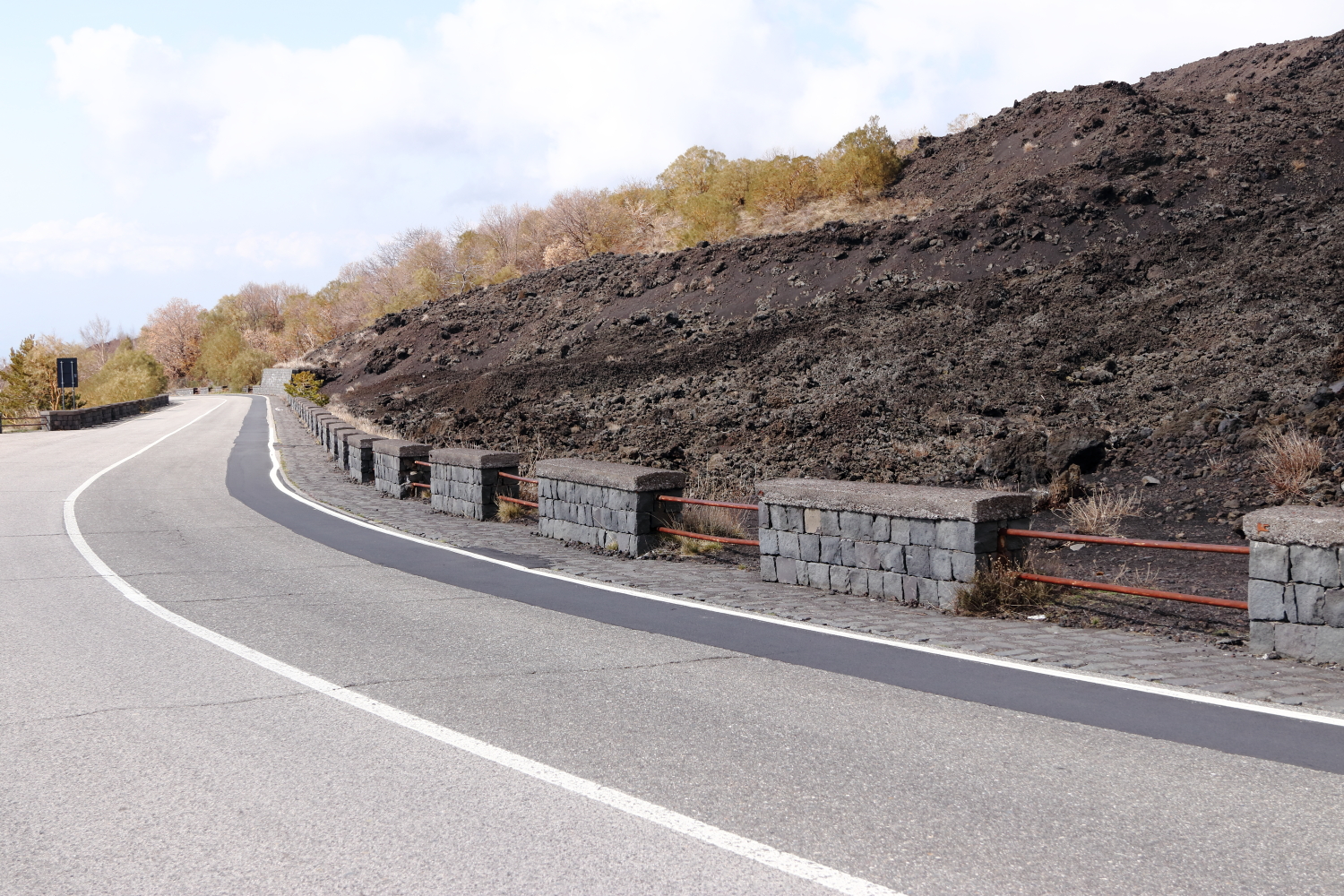 Nous venons de retrouver Doris et Werner sur l’aire de camping-cars, un couple suisse avec qui nous avions partagé un anniversaire et fait connaissance il y a quelques jours. L’amitié naissant, nous avons décidé de tenter ensemble la montée d’une partie de la face sud de L’Etna. Ce qui nous a frappés le plus en progressant sur la route, c’est le volume de lave déversée par le volcan sur des dizaines de km.