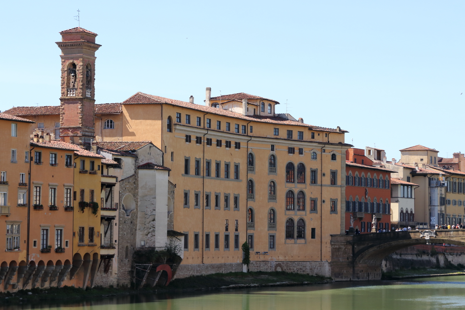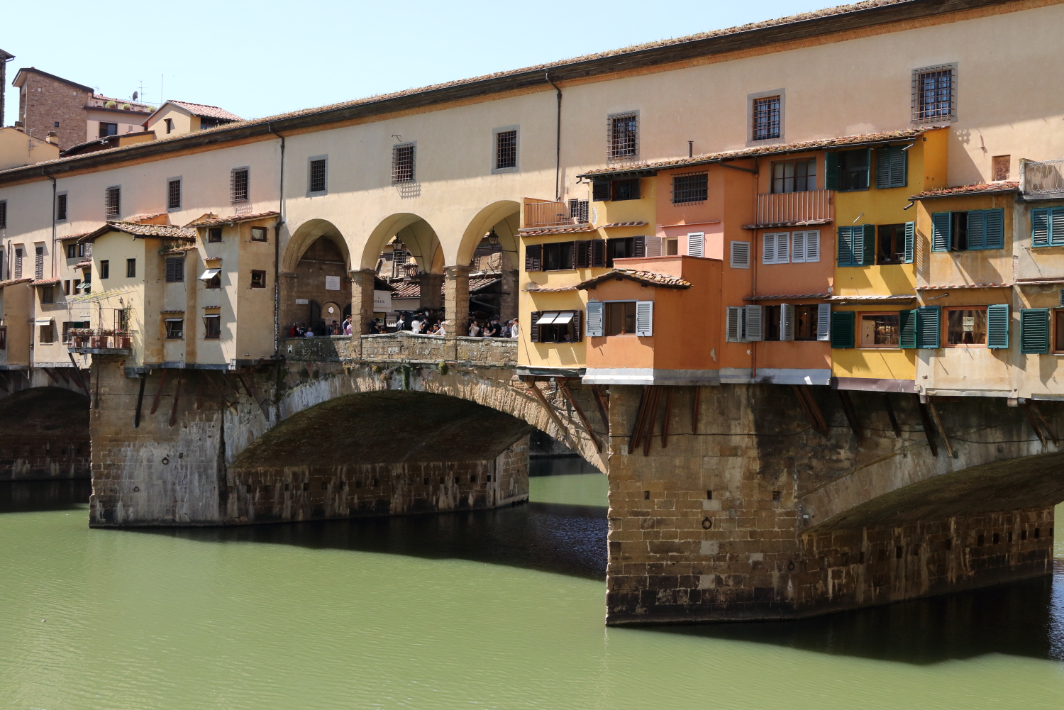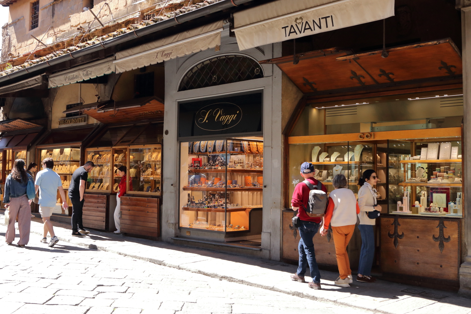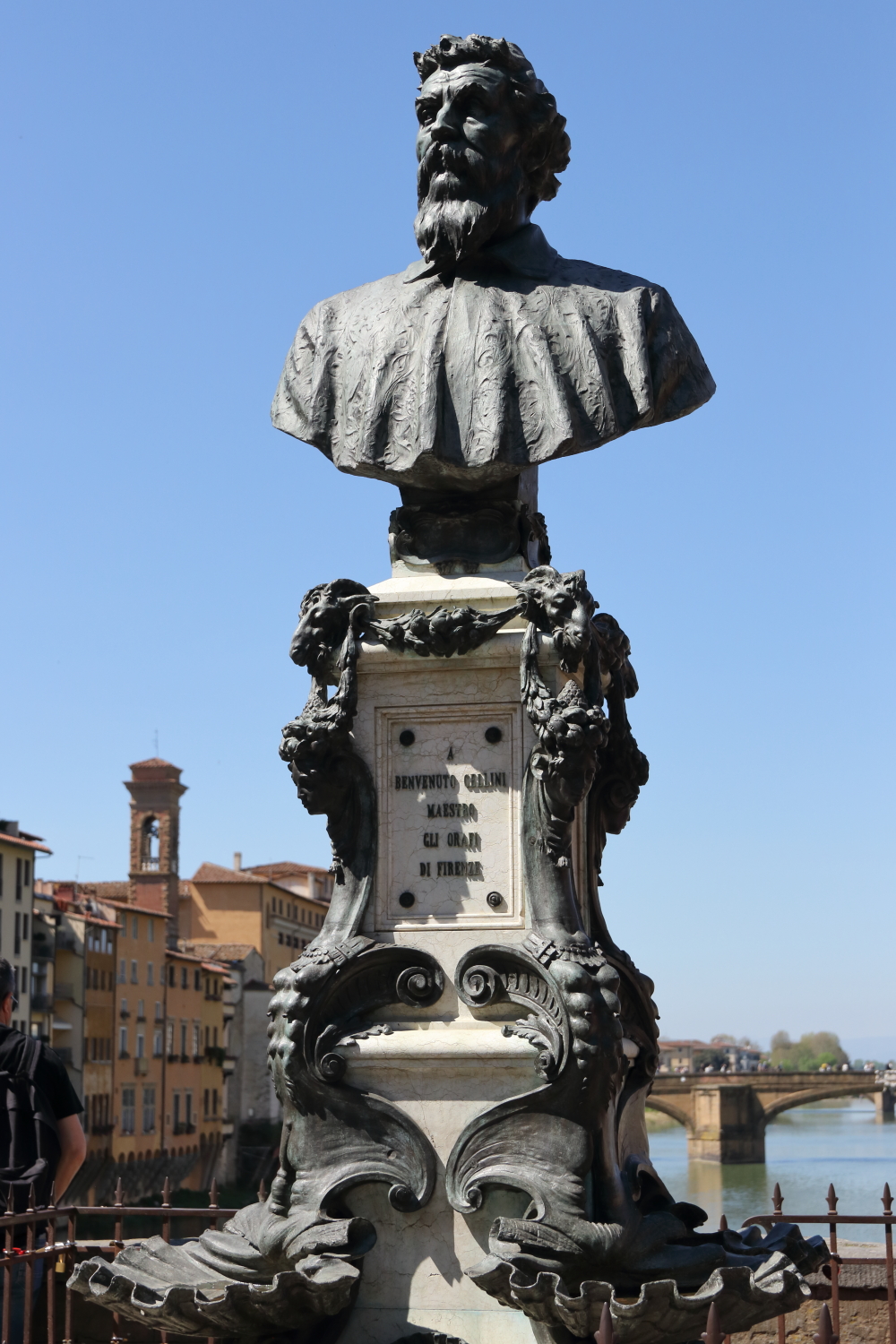 Orfèvre et sculpteur, le buste de Benvenuto Cellini trône sur le pont Vecchio. Avec leurs fermetures particulières, spécialisées principalement dans la bijouterie, une multitude de petites échoppes ont pris possession du plus célèbre pont de la ville.
